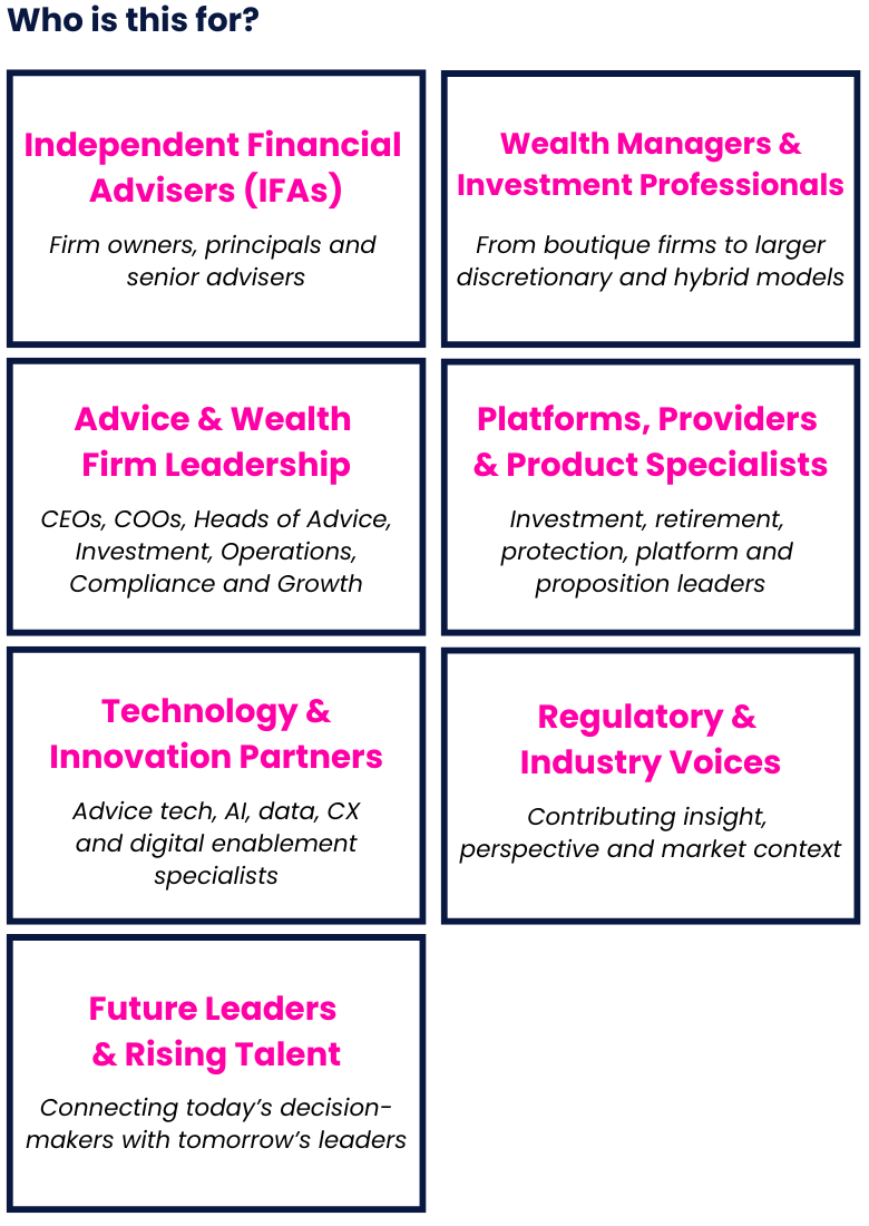 The Festival of Finance marks the launch of a bold, new flagship event for the UK financial advice and wealth management profession. Designed as a high energy festival rather than a traditional conference, the event will bring together 500 senior advisers, planners and wealth managers for a day of unrivalled insights, CPD learning, strategic dialogue, peer-to peer collaboration and meaningful commercial engagement — all wrapped in an inspiring, modern, festival-style experience.